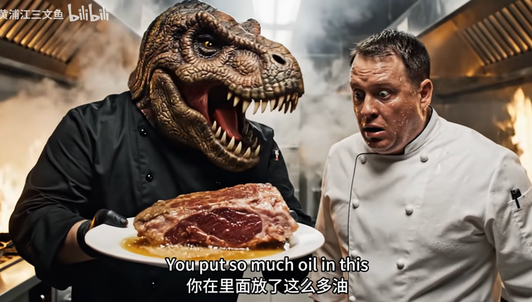 三文鱼的创作改编自真人秀节目《地狱厨房》。作为厨艺竞赛类内容的粉丝,三文鱼对这档节目中主厨戈登的经典台词和趣味梗印象深刻。当发现AI在视频生成上技术成熟,自然也要尝试——他想把恐龙和沧龙当作食材,没有AI可拍不出来。
