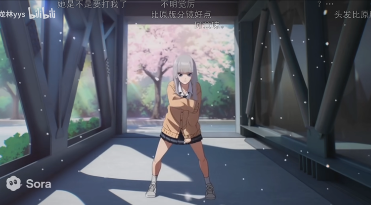 龙林在续写《你的名字》之前,先用Sora做了一段新番《绝妙舞步》的跳舞片段,来测试Sora在肢体语言方面的潜力。看过番剧的网友评论:这比原版好。
