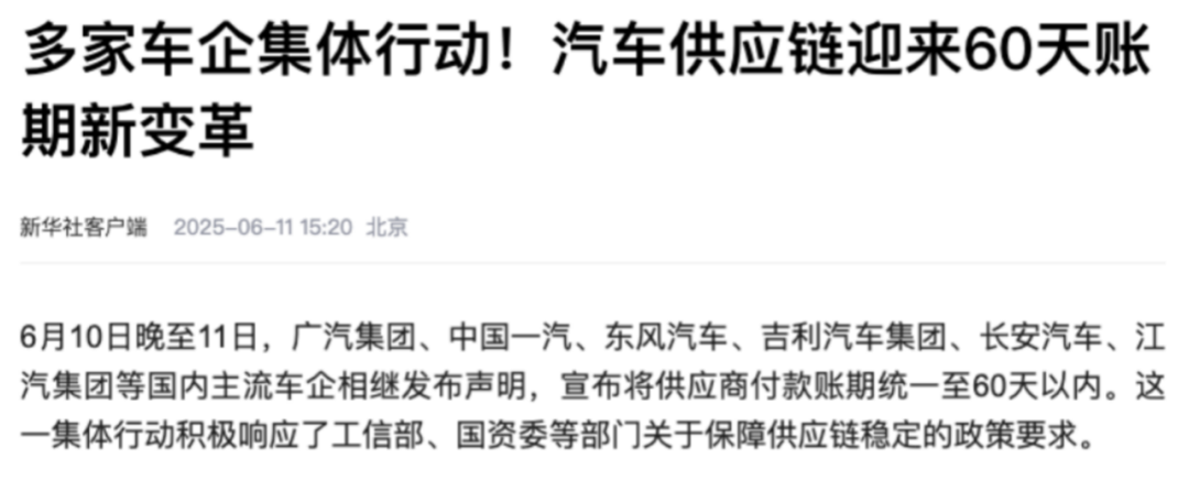 这一困境的背后,既源于“60天回款周期”定义的模糊性——其未明确是从交货日、验收日还是开票日起算,也未界定货款需以现金结算,还是可通过承兑汇票、应收账款电子凭证等非现金方式支付,这种模糊性为主机厂拖延回款提供了操作空间;更源于供应链厂商的被动处境:不少企业受生存压力所迫,秉持“保业务优先于保利润”的心态,对主机厂的账期要求不敢强硬反驳,进一步助长了主机厂的拖延底气。