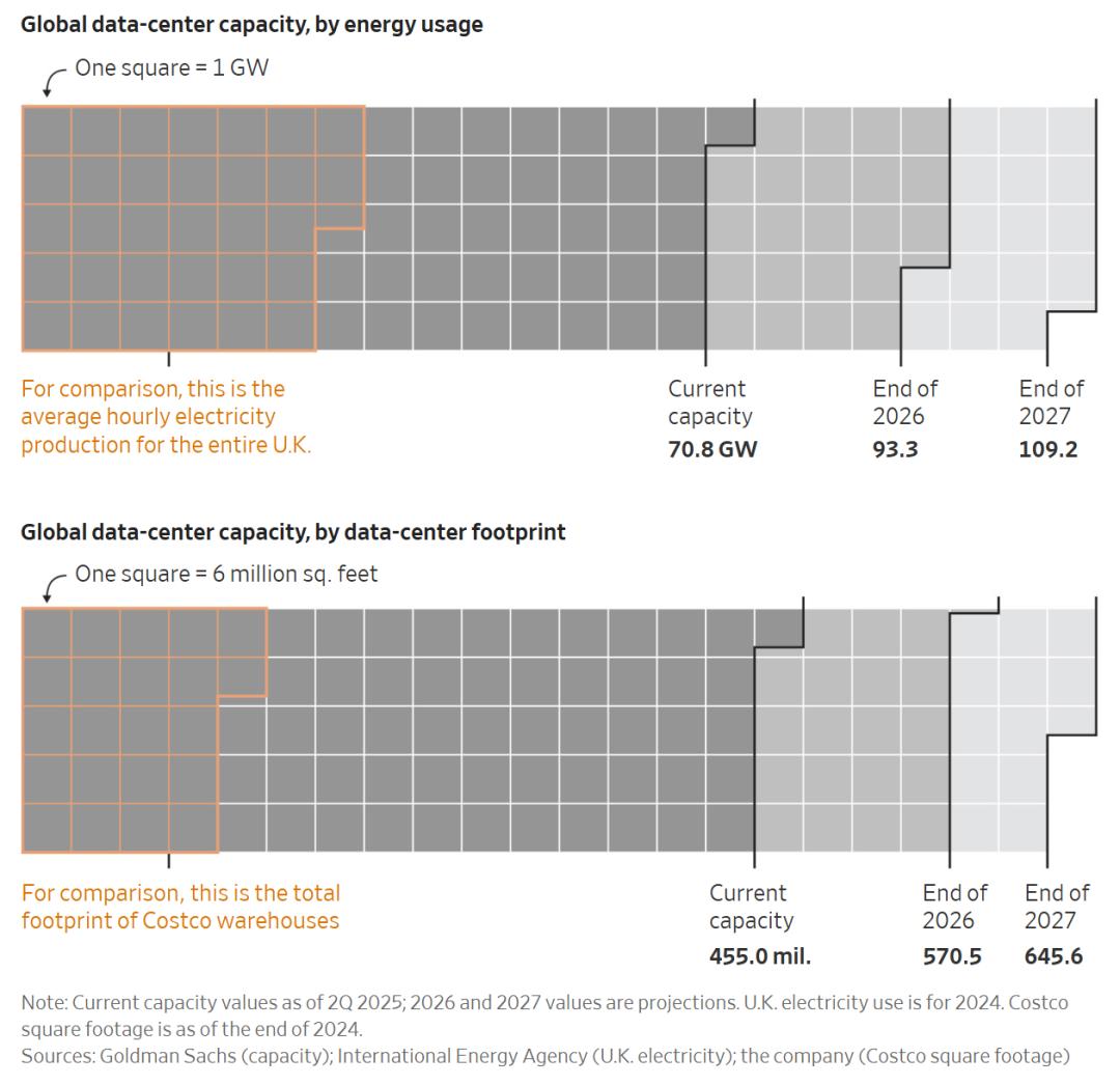 上:全球数据中心容量(按能耗计算);下:全球数据中心容量(按占地面积计算)