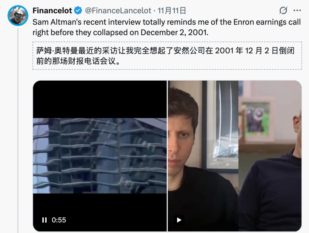 X上著名的KOL Financelot说,最近奥特曼的采访让他联想到了安然的那次电话会议。