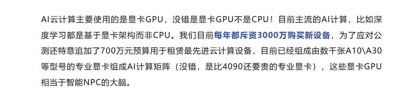 但同时,有资料显示,《王者荣耀》训练AI「绝悟」时,其测试架构就动用了60万个CPU核心和1064张显卡,保守估计成本达数亿元;网易《逆水寒》手游也曾表示,每年投入约3000万元用于AI云计算资源,以训练智能NPC。