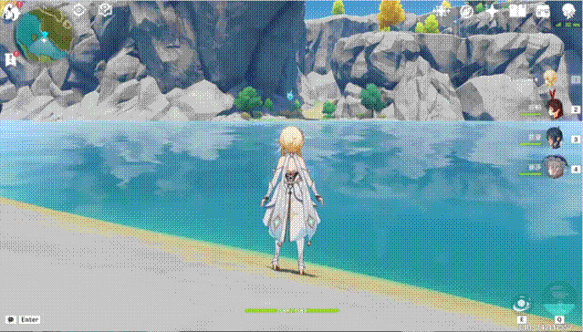 切换角色为凯亚,不断释放E技能冻结水面,以收集前方浮在水面上的风神瞳