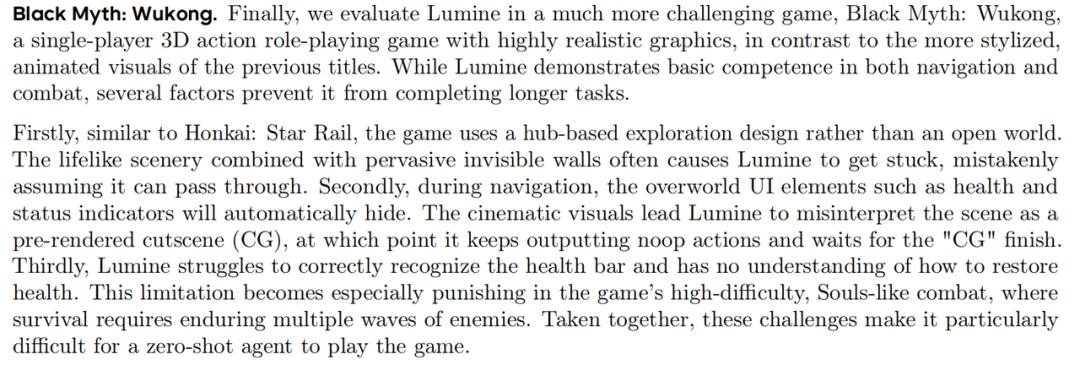 此外,尽管Lumine主要使用《原神》数据进行训练,但其目标却是打造通用型智能体。论文显示,团队也将Lumine的实测范围扩展至《鸣潮》《崩坏:星穹铁道》乃至《黑神话:悟空》,并取得了不错的结果: