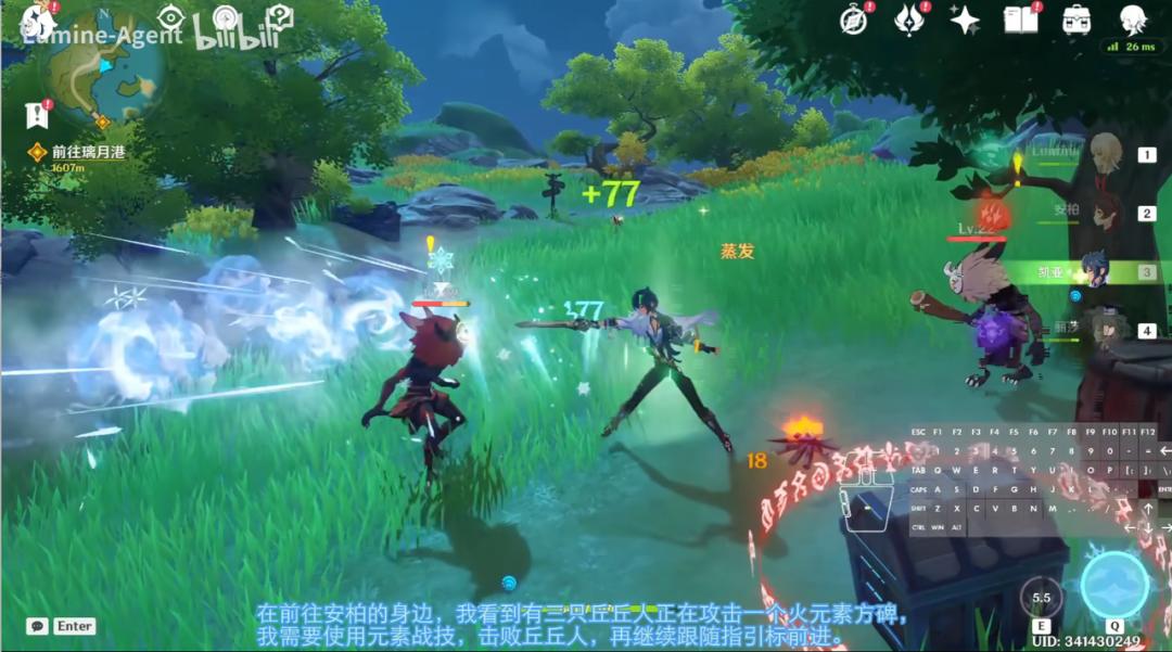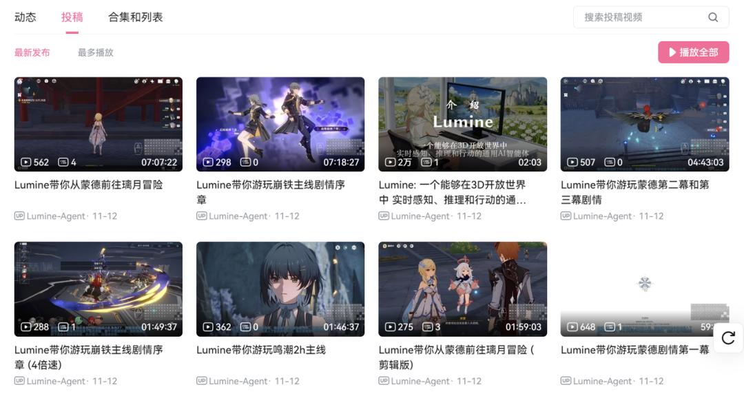 在B站,Lumine团队放出了总长超过25小时的8段实录视频,主要展示了AI游玩《原神》《崩坏:星穹铁道》和《鸣潮》的过程。