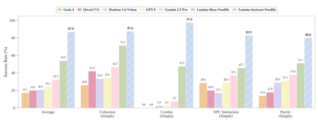 论文进一步指出,Lumine是目前唯一能在3D开放世界中完成数小时任务的AI智能体。在四项关键测试中,其特定版本「Lumine-Instruct-NonHis」的成功率均超过80%,性能显著优于GPT-5、Gemini 2.5 Pro、Grok-4、Qwen3-VL等主流大模型及其它基线方法。