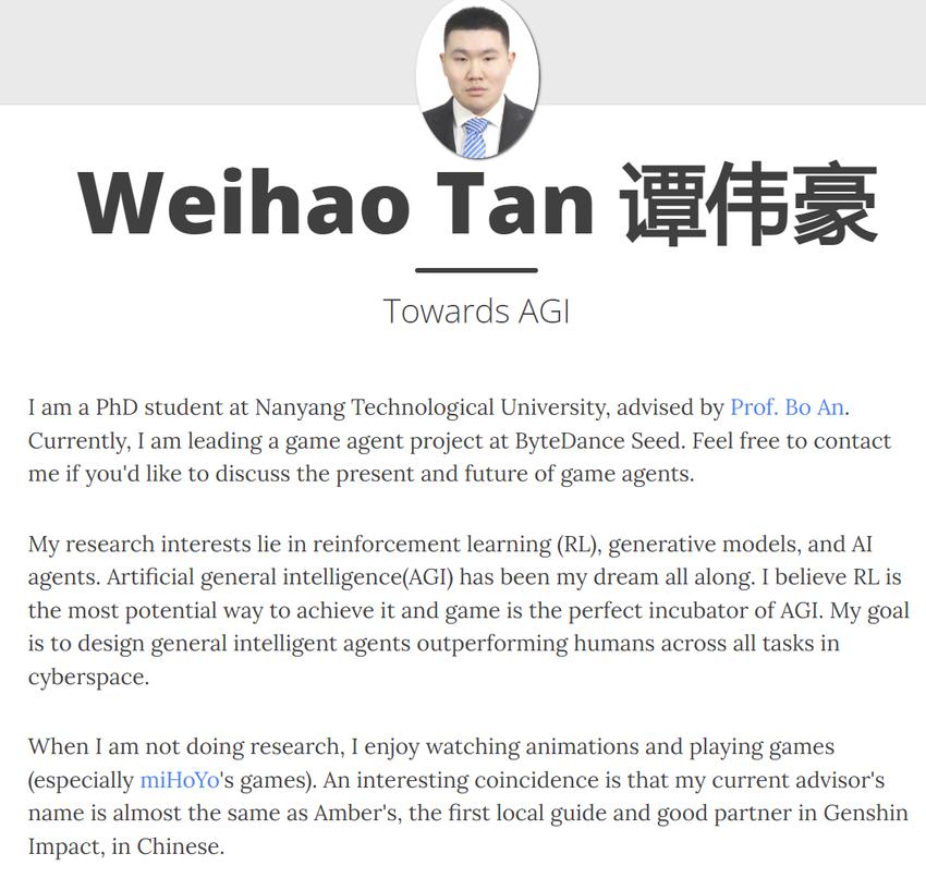 Lumine项目的负责人及论文主要作者谭伟豪,是南洋理工大学博士生。他在个人主页上表示自己很喜欢米哈游的游戏,巧的是,他的博士导师也叫「安柏」——与《原神》开篇的引路人安柏的中文名相似。