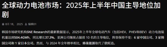 在动力电池行业,其磷酸铁锂、硅碳负极、电解液、隔膜等各个环节,都由中国企业把控。韩国市场分析机构SNE Research的数据显示,今年上半年,中国动力电池企业在全球市场的占有率持续提升,6家中国企业(宁德时代、比亚迪、中创新航、国轩高科、亿纬锂能、蜂巢能源)的市占率合计达到68.9%。