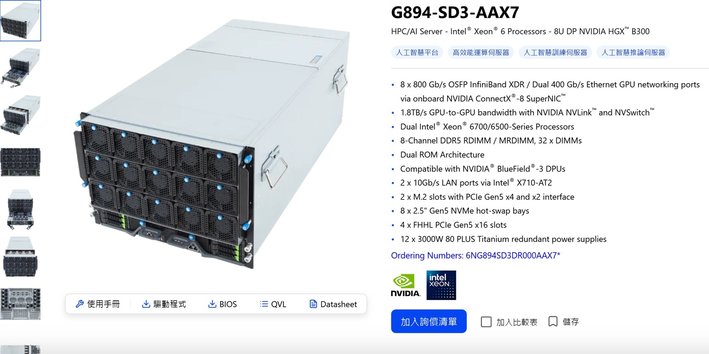 IT之家 11 月 17 日消息,技钢 Giga Computing 是技嘉旗下负责网通事业的子公司,该企业在今年 9 月发布了基于英伟达 HGX B300 平台的 8U 服务器 G894-SD3-AAX7,支持采用 FCLGA4710 平台的英特尔至强 6700 / 6500 处理器。