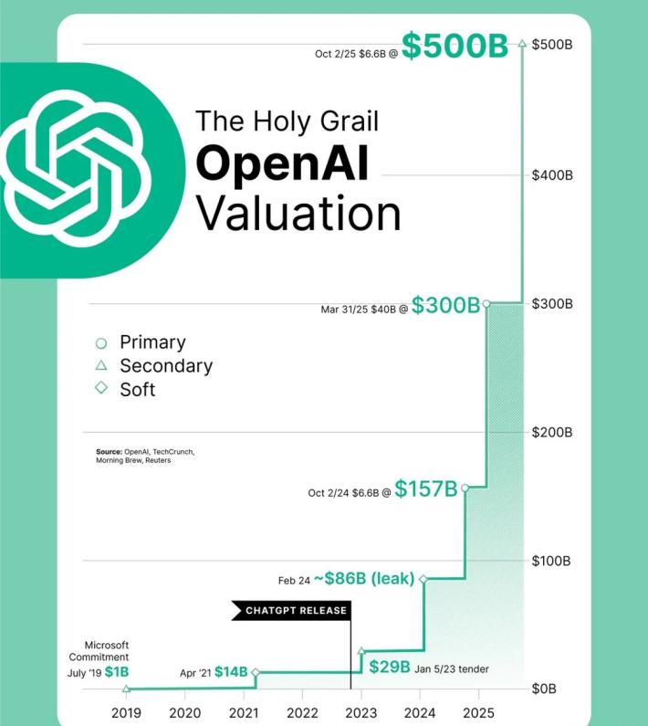 与之对应的是,OpenAI的估值被抬升至1万亿美元,并计划于2027年上市,或将成为全球规模最大的IPO。