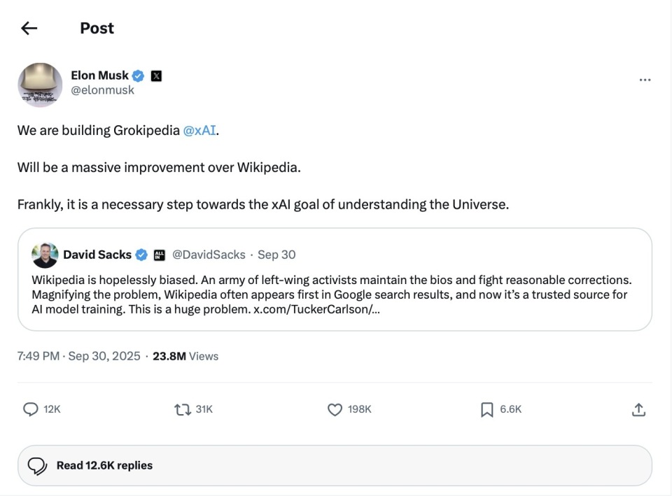 在10月27日Grokipedia上线后一天,埃隆·马斯克(Elon Musk)本人曾在社交平台上发帖宣称:“Grokipedia将在广度、深度和准确性上超过维基百科几个数量级。”这一野心勃勃的声明源于xAI旗下的聊天机器人Grok,该机器人被指示扫描维基百科前100万篇文章,并“添加、修改和删除”内容。