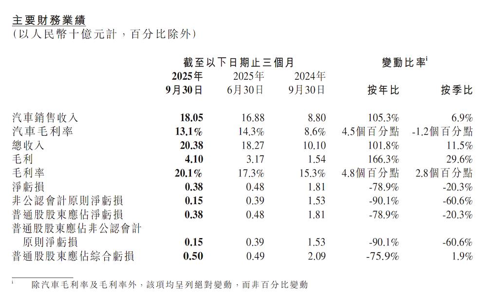净亏损方面,小鹏汽车今年三季度净亏损3.8亿元,去年同期为18.1亿元,而2025年第二季度为4.8亿元,实现大幅缩窄,这得益于汽车销量的稳步提升,以及毛利率的持续改善。