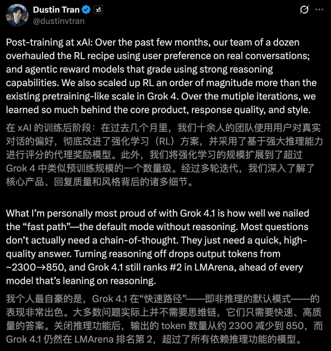 xAI研究员Dustin Tran表示,关闭推理后,输出Token数从约2300掉到850,即便如此,Grok 4.1也排在了榜单前面。