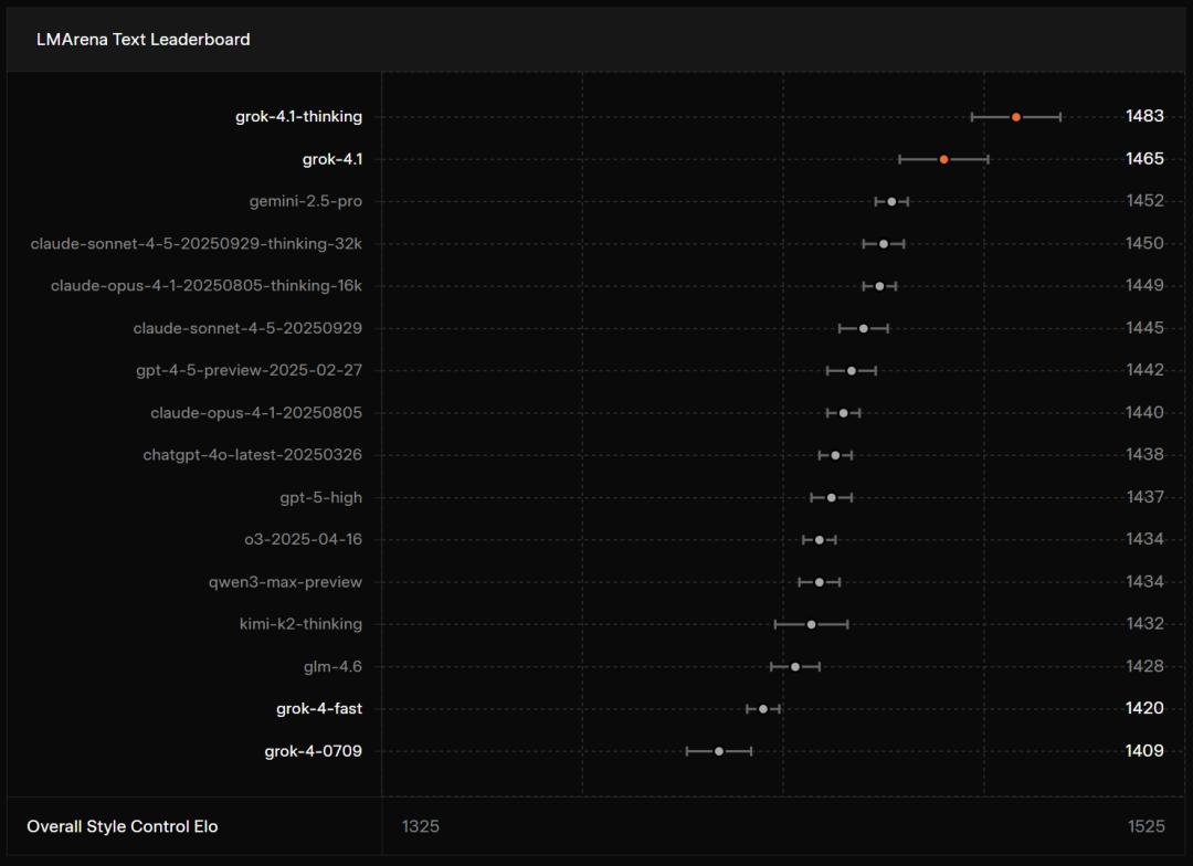 在LMArena排行榜上,Grok 4.1 Thinking拿下了1483 Elo的成绩,以绝对实力加冕全球大模型之王。