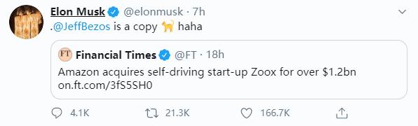 同年贝索斯发布「蓝月」月球着陆器,马斯克又恶搞 P 图把「Blue Moon」改成「Blue Balls」。2020 年,亚马逊花 12 亿美元收购自动驾驶公司 Zoox,马斯克又发推:「@JeffBezos 是个跟屁虫」。