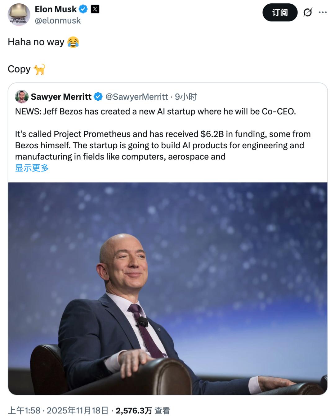 今天凌晨,当贝索斯要亲自下场做 AI 公司的消息刚在网上发酵,马斯克就火速转发推文,并附带一句话: