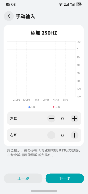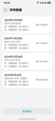 在所有数据页面,还有“手动输入”入口,点击该入口可以显示手动输入听力测试结果的页面,该方式适用于已经从专业医疗渠道获取听力测试结果,手动输入以便应用到助听功能中的情况。