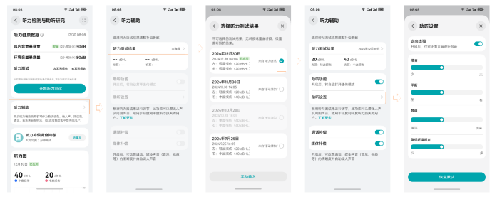 进入“听力辅助”页面:在体验听力测试功能的基础上,点击“听力检测与助听研究”页面内的“听力辅助”入口,即可进入“听力辅助”页面。
