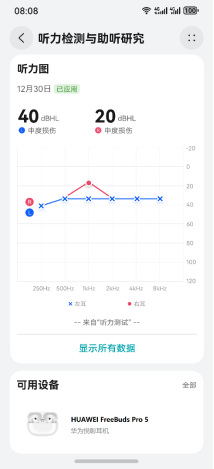 完成测试后,“华为创新研究”App 会自动生成听力图,并显示你的整体听力损伤情况。听力损伤情况分为 5 类:无损伤、轻度损伤、中度损伤、重度损伤、极重度损伤,仅轻度损伤、中度损伤的听力图可应用到助听设置中。