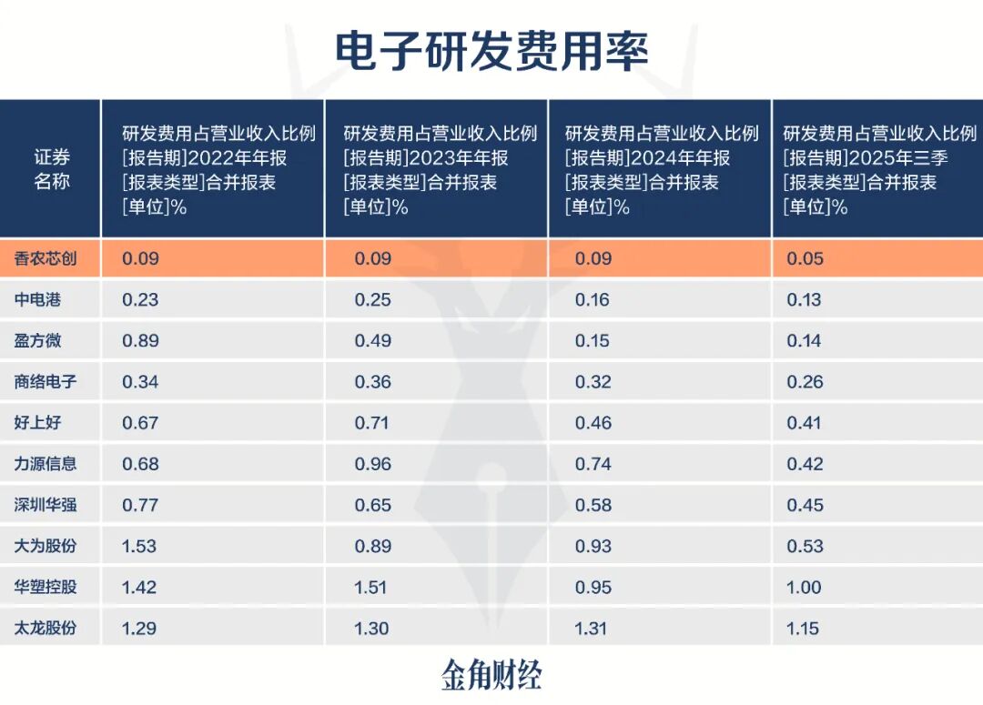 在申万电子行业488家上市公司中,2022-2024年和2025年前三季度,香农芯创的研发费用率都排在垫底位置,而且是都低过0.1%。