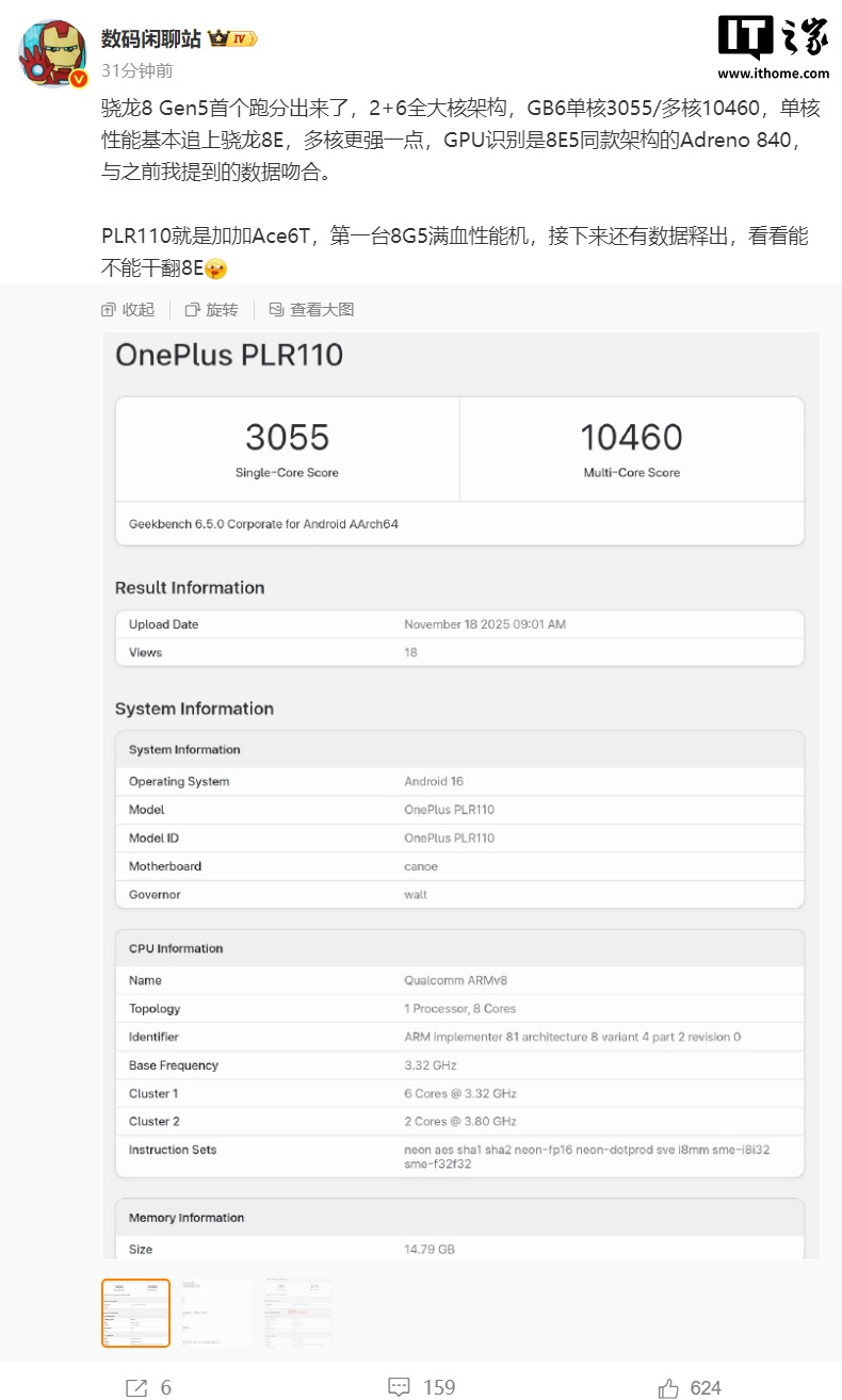 IT之家 11 月 18 日消息,一加 PLR110 新机今日现身 Geekbench 跑分平台,博主 @数码闲聊站 表示这是一加 Ace 6T,第一台骁龙 8 Gen5 满血性能机。