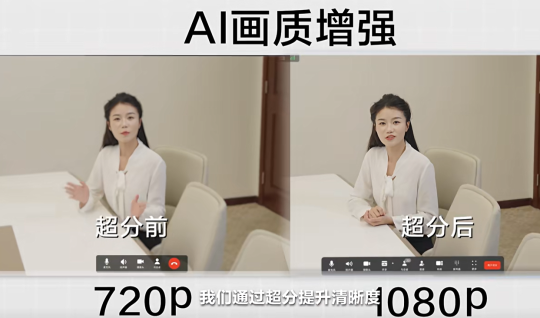 在“看得清”层面,华为 IdeaHub 系列产品并未满足于通用的 4K 标准,而是采用了专业级的 1800 线 4K 摄像机。而针对一些云会议,视频清晰度一般在 360P 到 720P 这个区间。为了让大家在有限条件下获得更清晰的视频体验,华为推出了 AI 画质增强功能,其中的视频超分能力可以自动提升清晰度,从 360P 到 720P,甚至到 1080P。