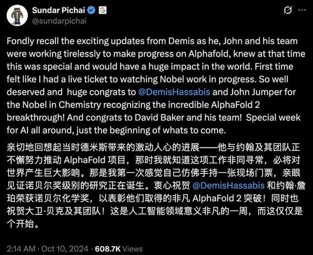 首席执行官Sundar Pichai在社交平台X上称「这是人工智能领域意义非凡的一周,而且仅仅只是一个开始」。