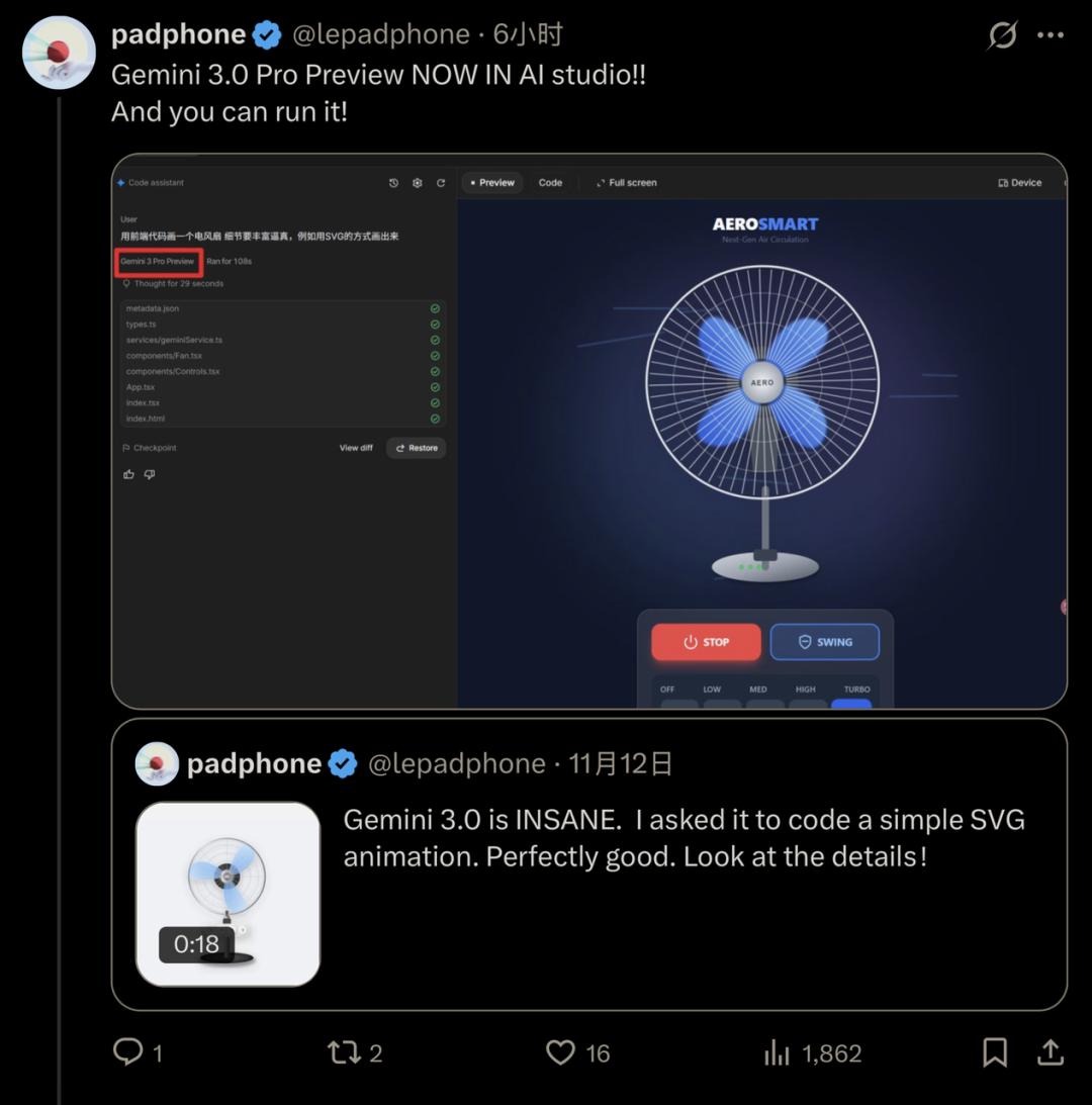 而现在用一句话,就能让 Gemini 做出高质量的交互式 SVG。比如下面这个在 X 上很火的“电风扇”,不仅图像精美,而且还能动、能交互,完全到了可以直接拿来用的程度。