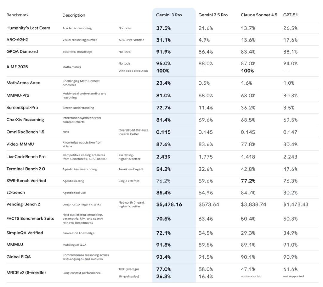 Gemini 3 Pro 晒出成绩单,它不仅完全把前辈 Gemini 2.5 Pro 拍死在沙滩上,还在除“解决真实 GitHub 问题(SWE-Bench Verified)”这一项之外,全面碾压了 Claude Sonnet 4.5 和 GPT-5.1。