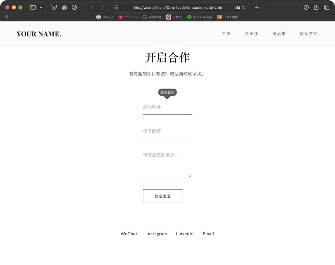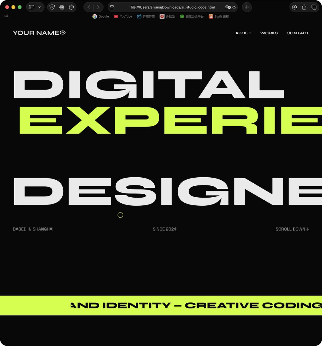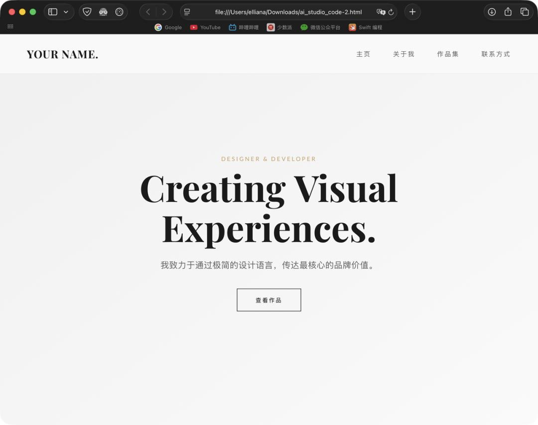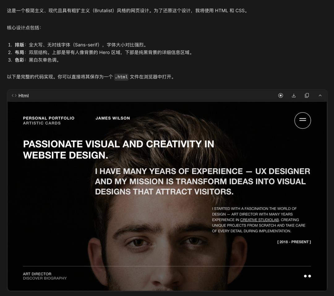 我自己也实际测了一番。我让 Gemini 帮我做了个个人网站,要求是有四个页面,分别是主页、个人介绍、作品、联系方式。风格要现代简约,高端大气。