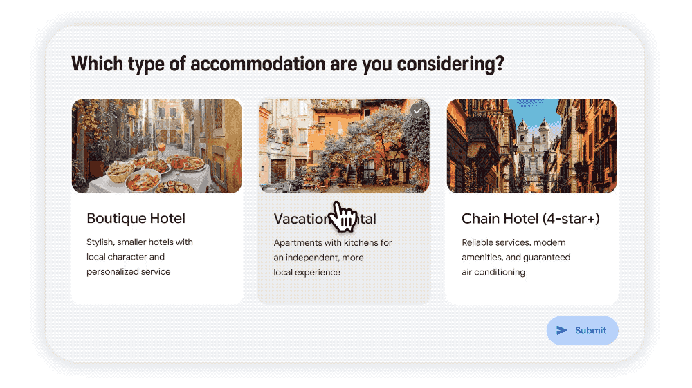 简单来说,Gemini 应用未来可以直接用可交互的 UI 来回答你的问题,响应你的指令。而不再是以往一个模子刻出来,“一问一答”的大模型交互形态和使用方式了。
