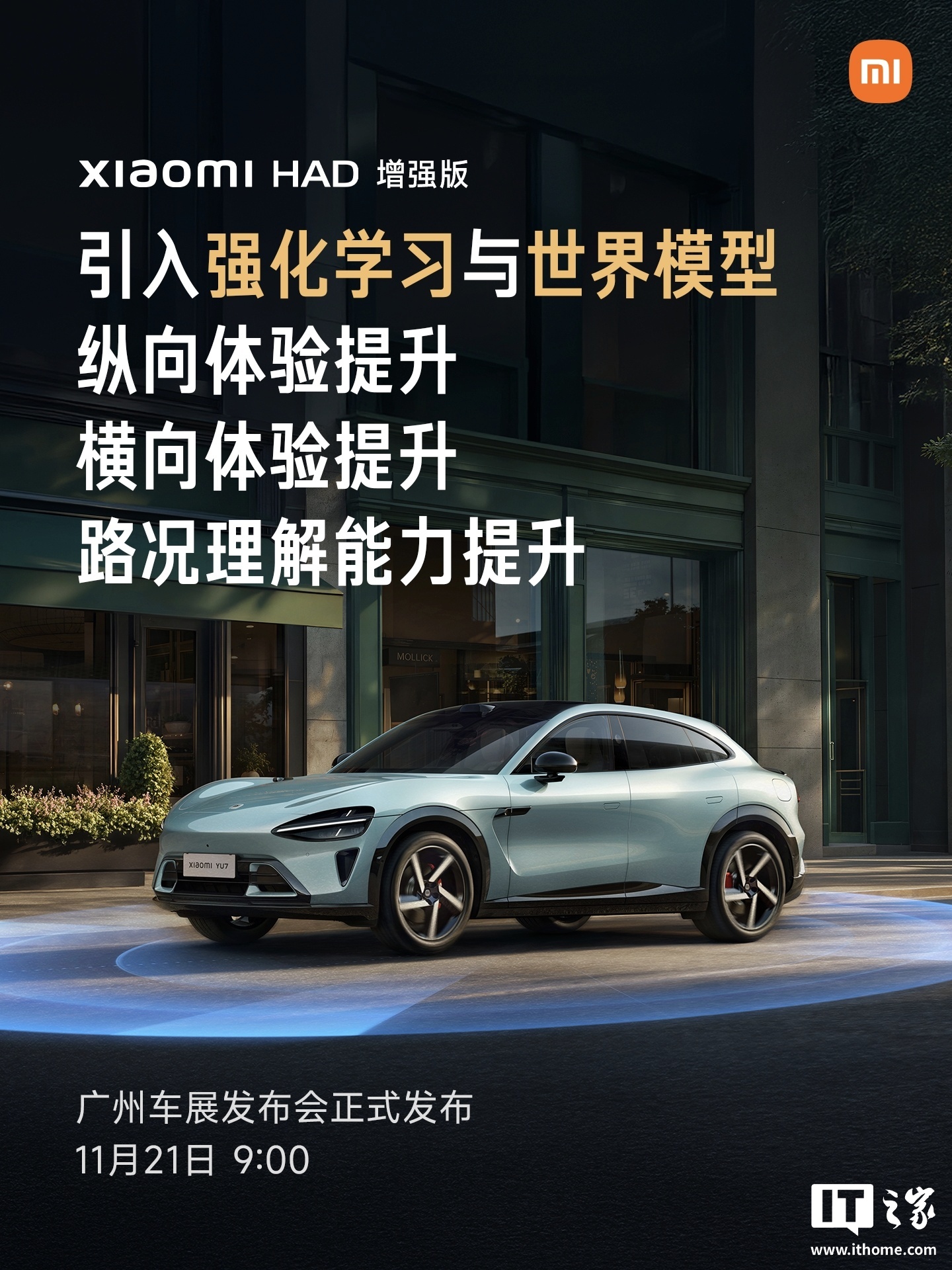 IT之家 11 月 19 日消息,小米端到端辅助驾驶「Xiaomi HAD 增强版」将于本周五 11 月 21 日早 9 点,在广州车展正式发布。小米汽车副总裁李肖爽今日发文,对其进行预热。