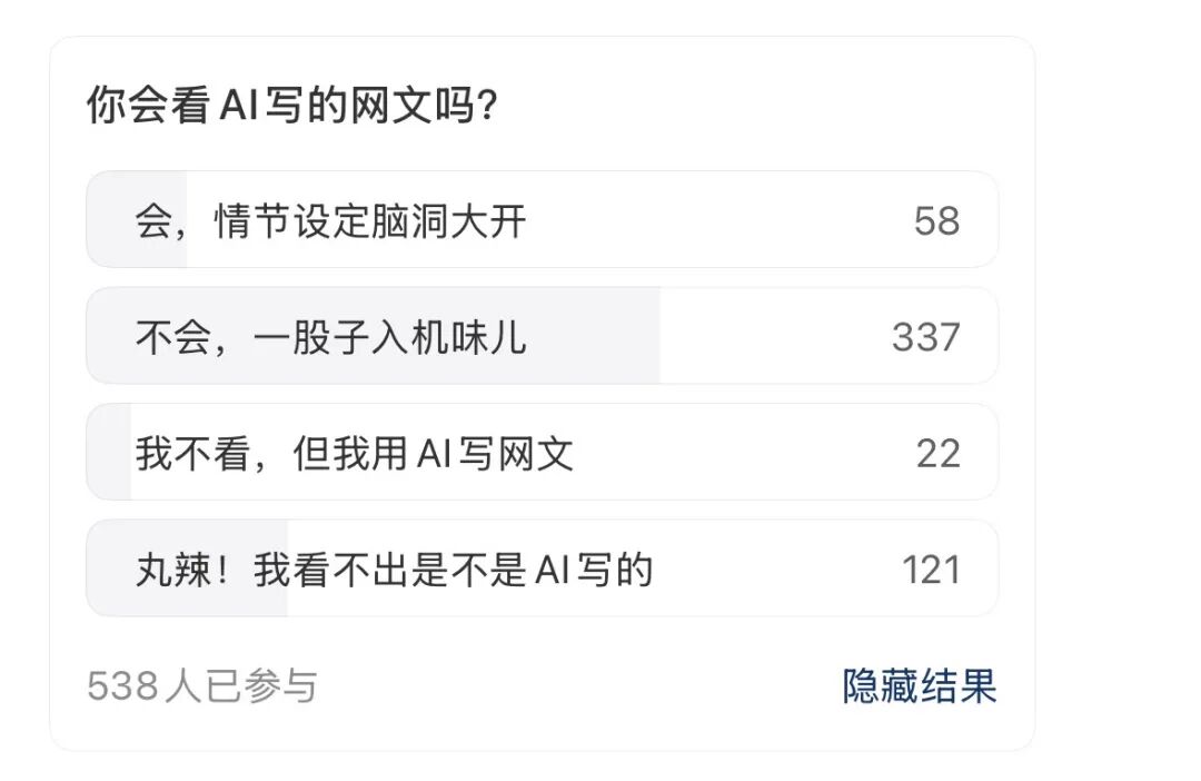 我们在小红书发起了一个调查:「你会看 AI写的网络小说吗?」截至发稿,投票的538名网友中,超过337人明确表示:不会。