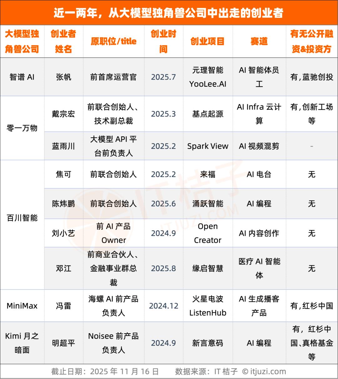 百川智能是目前国内几家大模型独角兽中,核心联创团队出走最多的,可以说是“核心团队分崩离析”;但也是“培养”创业者最多的。