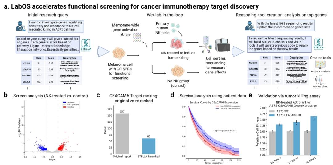 癌症免疫学的关键挑战在于识别介导肿瘤免疫逃逸的关键基因。传统筛选方法受限于通量且依赖专家经验分析。LabOS 在此展现了其 “干实验 - 临床分析 - 湿实验” 全流程研究能力:系统首先通过 CRISPR 激活筛选技术,在黑色素瘤细胞中自主识别并迭代优化 NK 细胞杀伤抵抗的候选基因 CEACAM6;随后利用癌症基因组图谱(TCGA)数据进行生存分析,建立 CEACAM6 基因表达与患者预后的临床相关性;最终通过湿实验验证,确认 CEACAM6 的激活显著增强肿瘤对 NK 细胞的抵抗能力。这一从计算推理到实验验证的端到端闭环,体现了 LabOS 在靶点发现中的系统性研究能力。