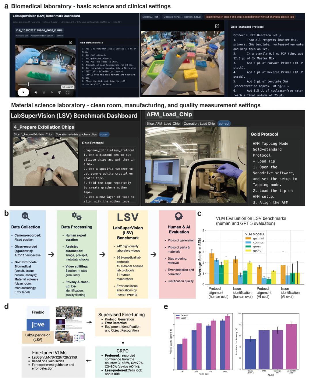 能理解的 “眼”:专为实验室打造的视觉语言模型。团队收集了超过 200 段第一视角的实验视频,构建了 LabSuperVision(LSV)基准。他们发现,即便是最强的通用大模型,在理解精细实验操作上也表现不佳。为此,他们训练了专用的 LabOS-VLM,使其在错误检测等任务上准确率远高于通用模型。