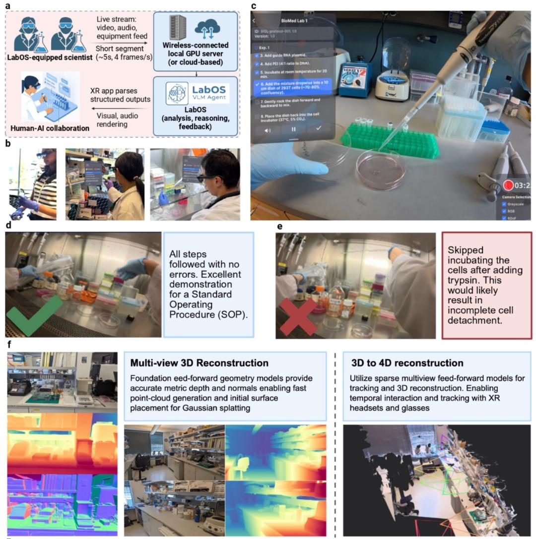 图 2:物理实验室场景的 4D 重构,LabOS 通过 XR 眼镜实现人 - 机器人一体化的实时协作