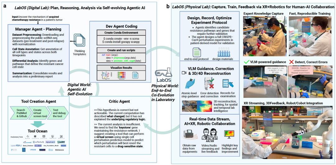 图 1:LabOS 系统架构,融合了干实验的自我进化 AI 智能体与湿实验的 XR + 机器人的人机交互,实现端到端的科学发现