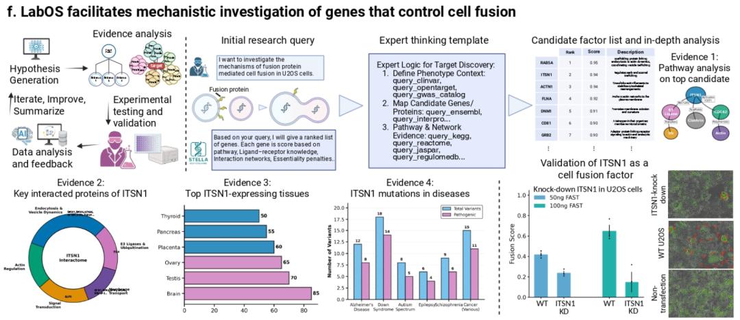 在细胞融合这一基础生物过程的机制研究中,LabOS 展现出强大的科学假说生成和验证能力。LabOS 通过整合通路富集分析、互作先验与功能性证据,自主将 ITSN1 提名为核心调控基因。随后,研究团队通过 CRISPR 干扰技术,在 U2OS 细胞模型中进行细胞融合的功能性验证。定量成像与细胞实验结果显示,ITSN1 的敲低确实显著抑制了细胞融合过程。这一从 AI 生成的科学假说到湿实验验证的完整闭环,充分体现了 LabOS 作为协科学家在推动机制发现层面的独特价值。