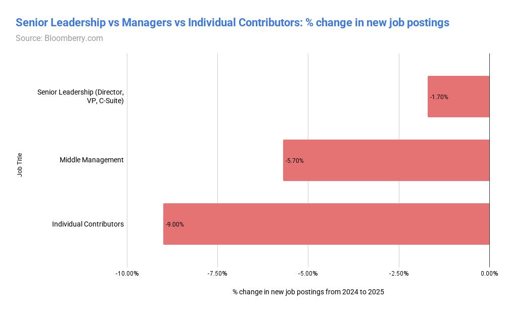 虽然整体就业市场萎缩了8%,但高级领导职位几乎没有减少。