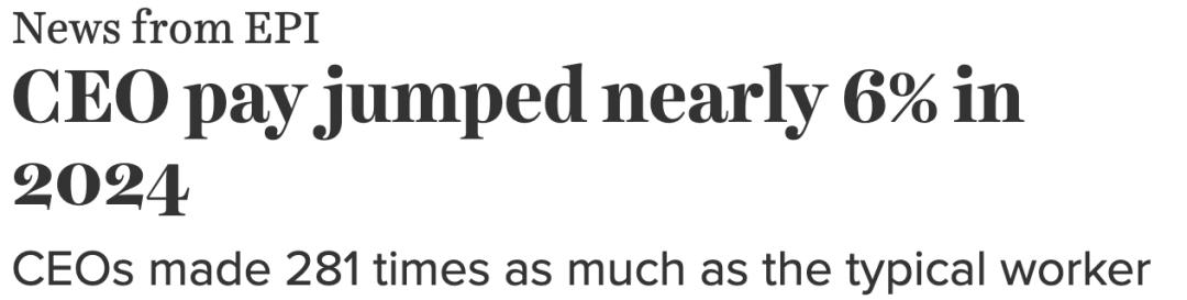 据EPI最新统计数据显示,2024年美国顶级上市公司CEO的薪酬是普通工人薪酬的281倍,过去几年这个数字一直在300倍左右。