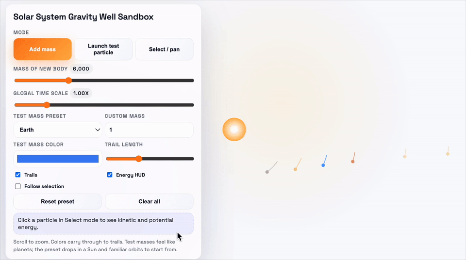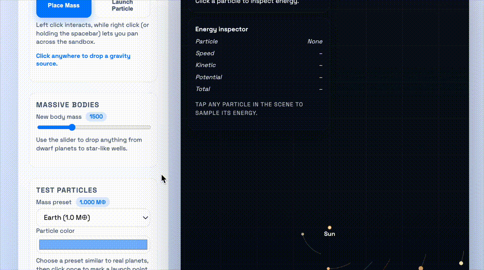 这个demo要求的是,做一个太阳系引力井沙盒,需要可视化物体在2D引力势场中的运动,并支拖动平移视图、环绕观察场景。