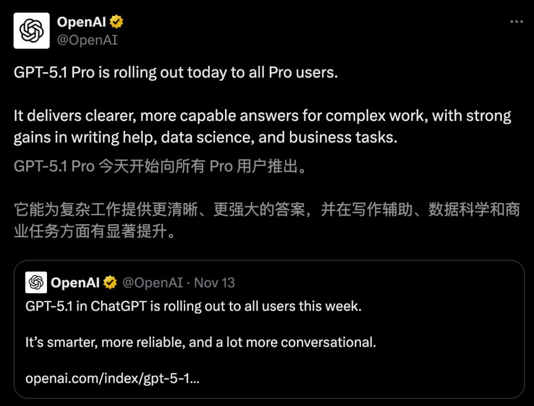 前两天,先是Grok 4.1、Gemini 3 Pro发布,今天OpenAI GPT-5.1 Pro也静默登场了!