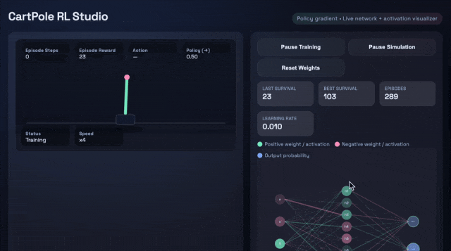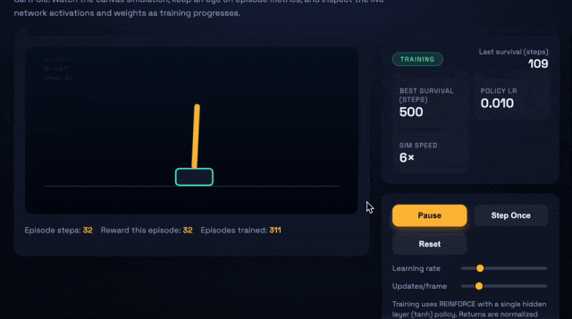 比如,让它们生成一个浏览器应用——即可交互的CartPole强化学习沙盒,需要包括小型策略梯度控制器、指标面板,以及一个SVG网络可视化器。