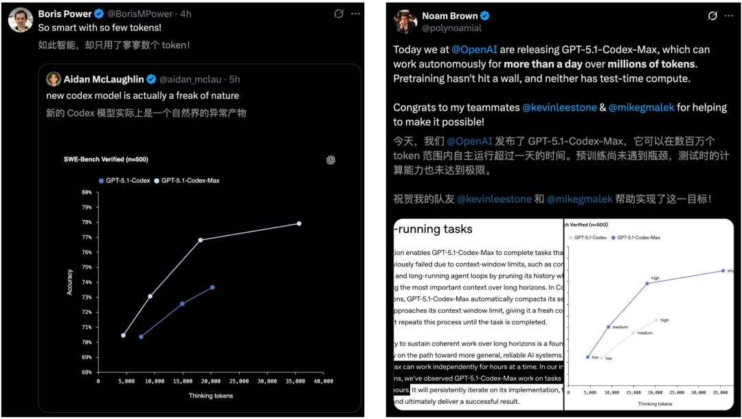在同样「medium」(中等)推理强度下,它不光表现比GPT-5.1-Codex更好,而且思考过程所用的token量减少约30%。