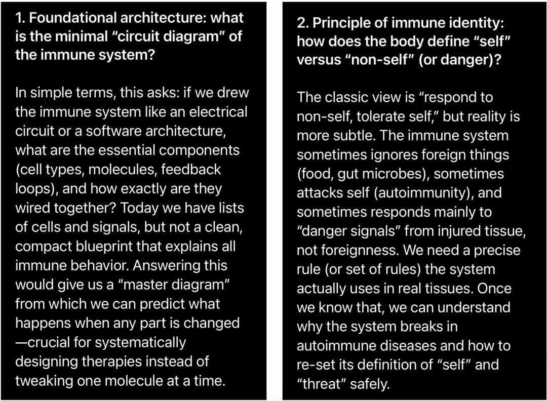 在下面的例子中,他分别向5.0和5.1 Pro询问了免疫学领域最重要的未解之谜,并要求这两个模型深入浅出地剖析每个问题,以便让没有免疫学学位的人也能理解其重要性。