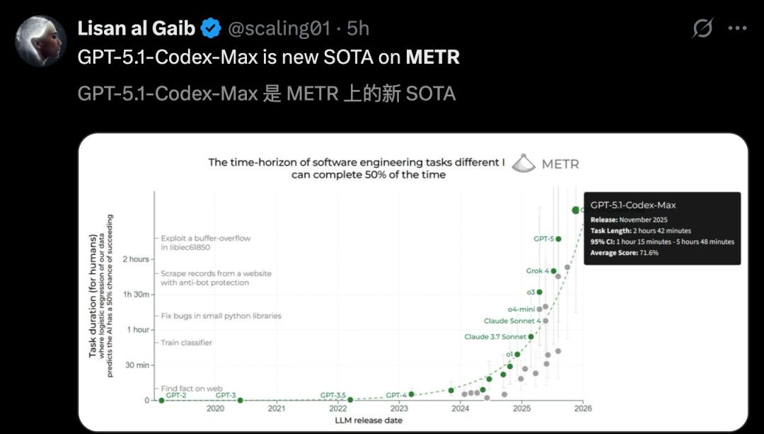 在METR评估中,GPT-5.1-Codex-Max长程任务能力,成为了新的SOTA。