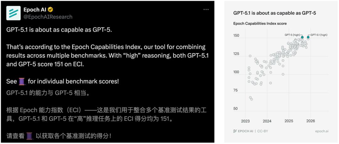 对于GPT-5.1迭代后的性能,Epoch AI三方评估后称,几乎与GPT-5实力相当。