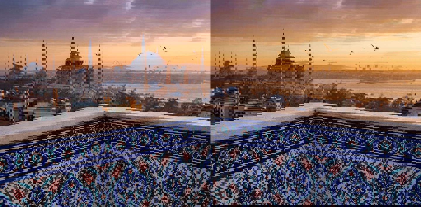 提示词:A cinematic, wide-angle view of Istanbul during the golden hour. In the foreground, intricate Ottoman tile patterns on a balcony railing are in sharp focus. In the background, the Hagia Sophia and the Blue Mosque dominate the skyline across the Bosporus, silhouetted against a warm, hazy orange and purple sunset. Seagulls are flying in the distance. Photorealistic, 8k resolution. —ar 2:1