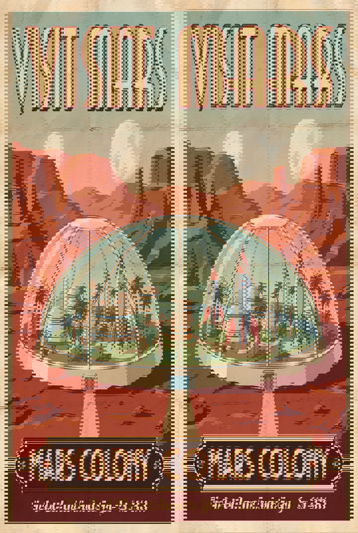 提示词:A vintage travel poster for "MARS COLONY." The main visual is a retro-futuristic biodome on a red landscape. Large, bold Art Deco typography at the top says "VISIT MARS," and smaller text at the bottom says "The Red Planet Awaits You - Est. 2050." Texture of worn paper. —ar 2:3